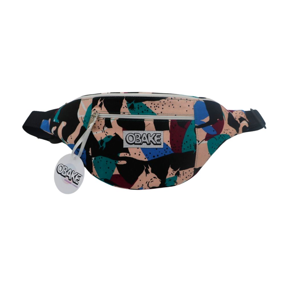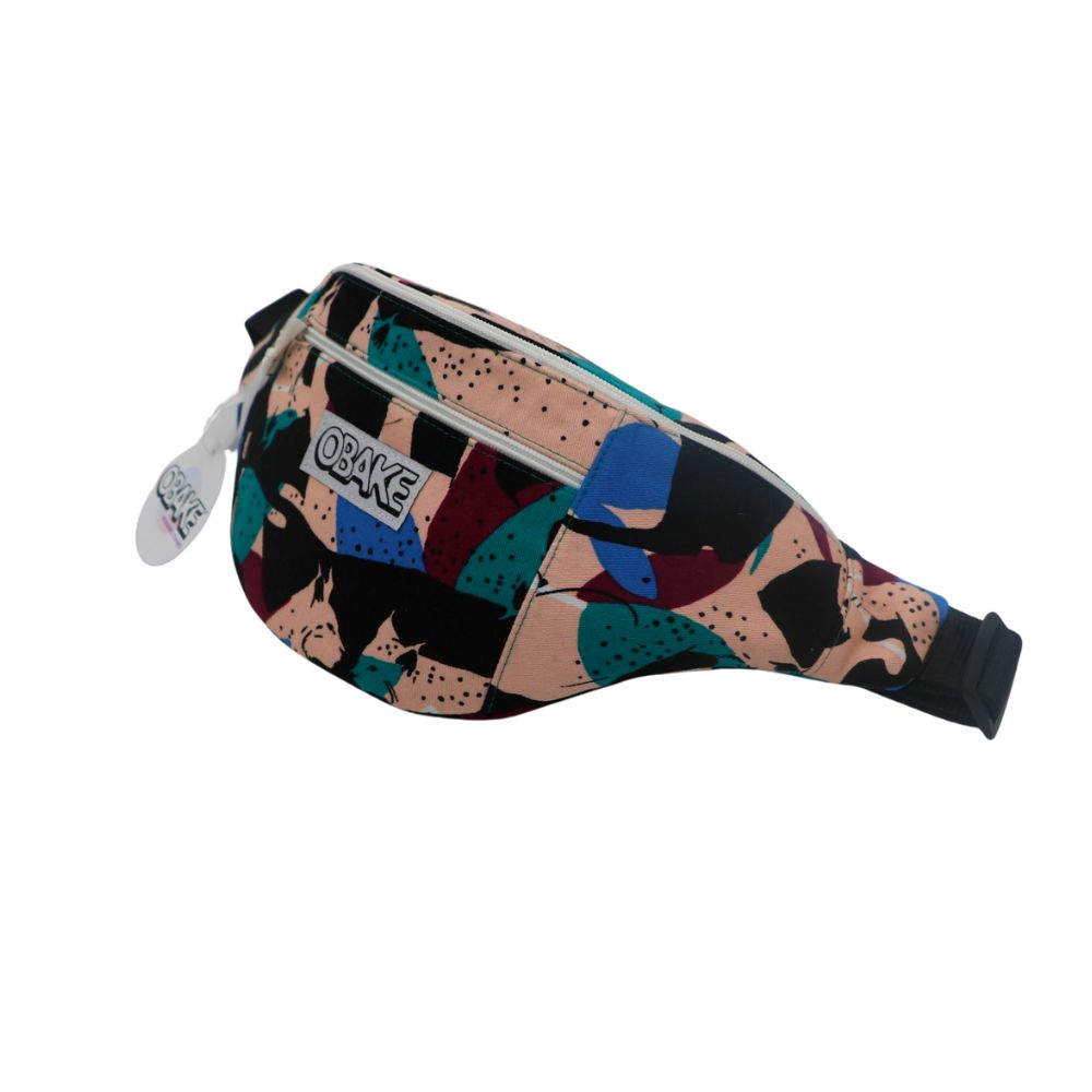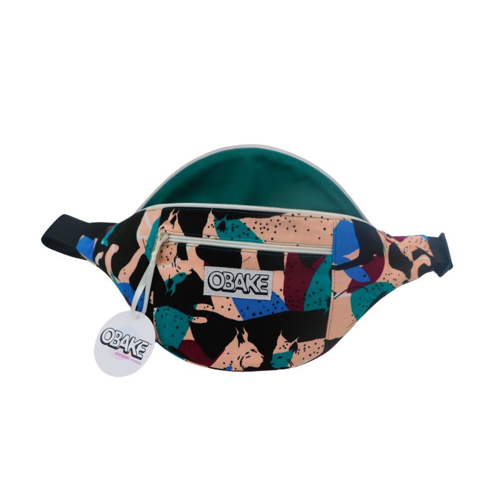 Banane motif lynx bleu canard, bleu, rose pale, pourpre. Sangle noire réglable, fermeture éclair blanche, doublure intérieure bleu canard.