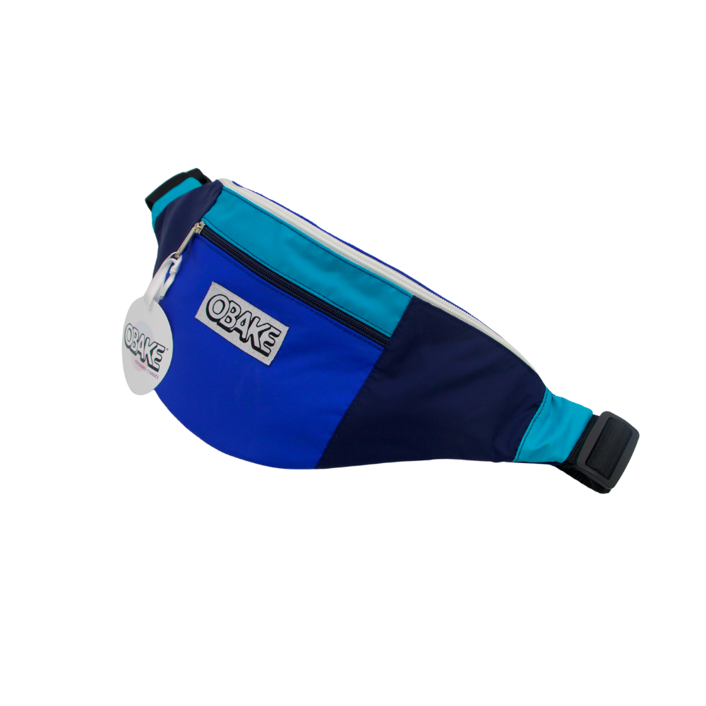 Sac banane imperméable aux trois nuances de bleu : bleu, bleu marine et bleu céleste. Ce sac résiste à la pluie.
