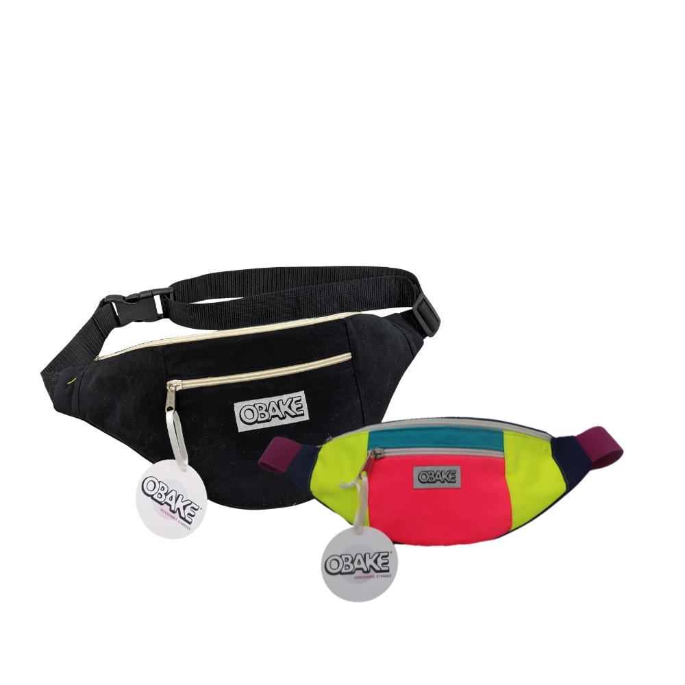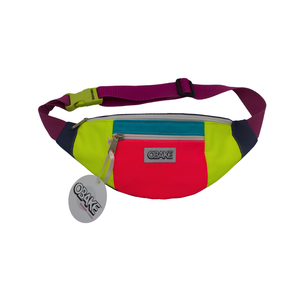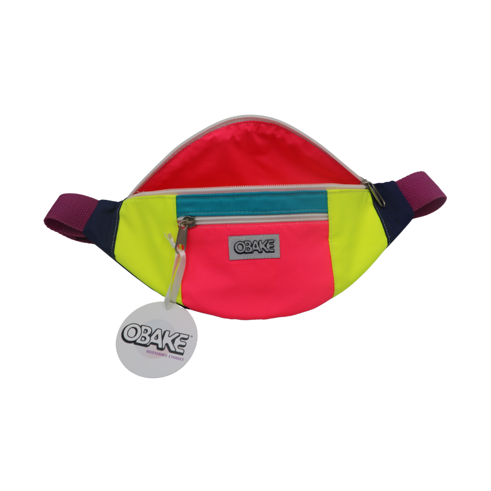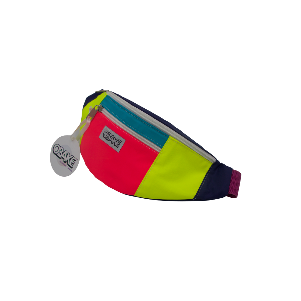 Banane imperméable petit format bleu, rose fluo et jaune fluo.