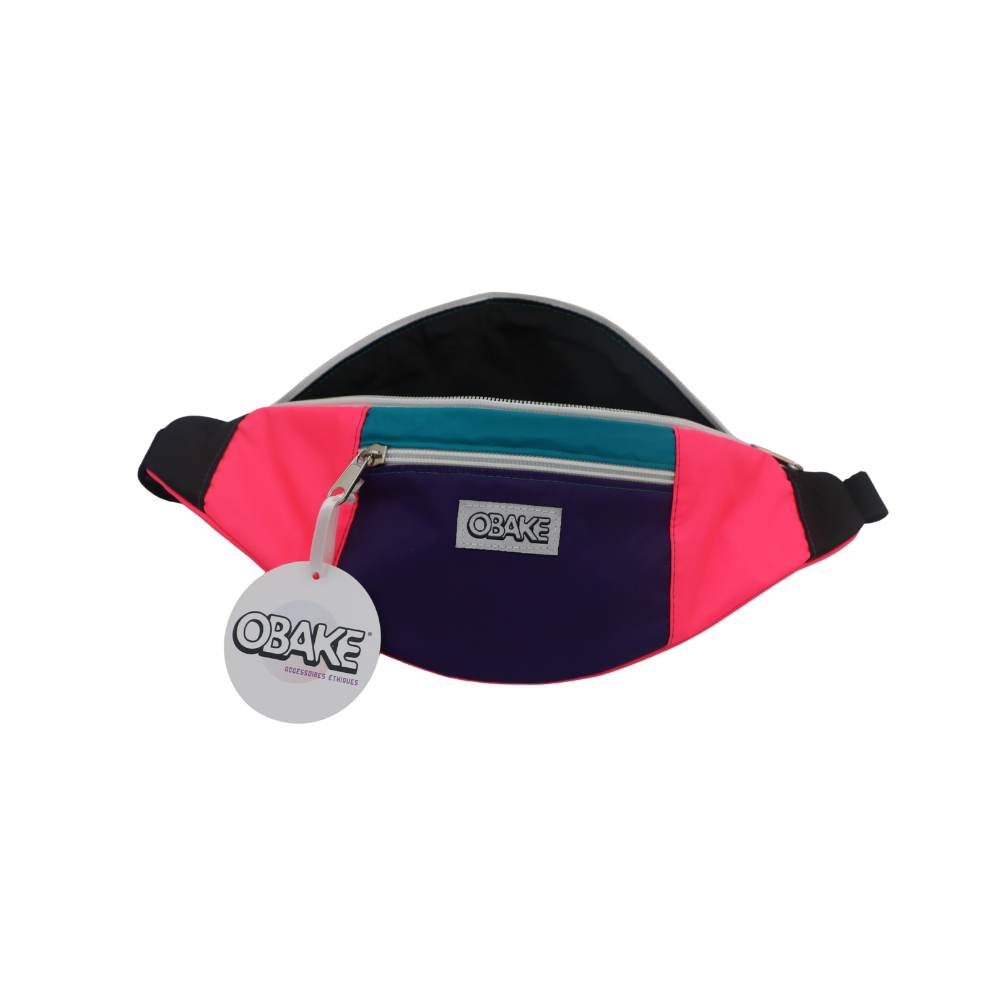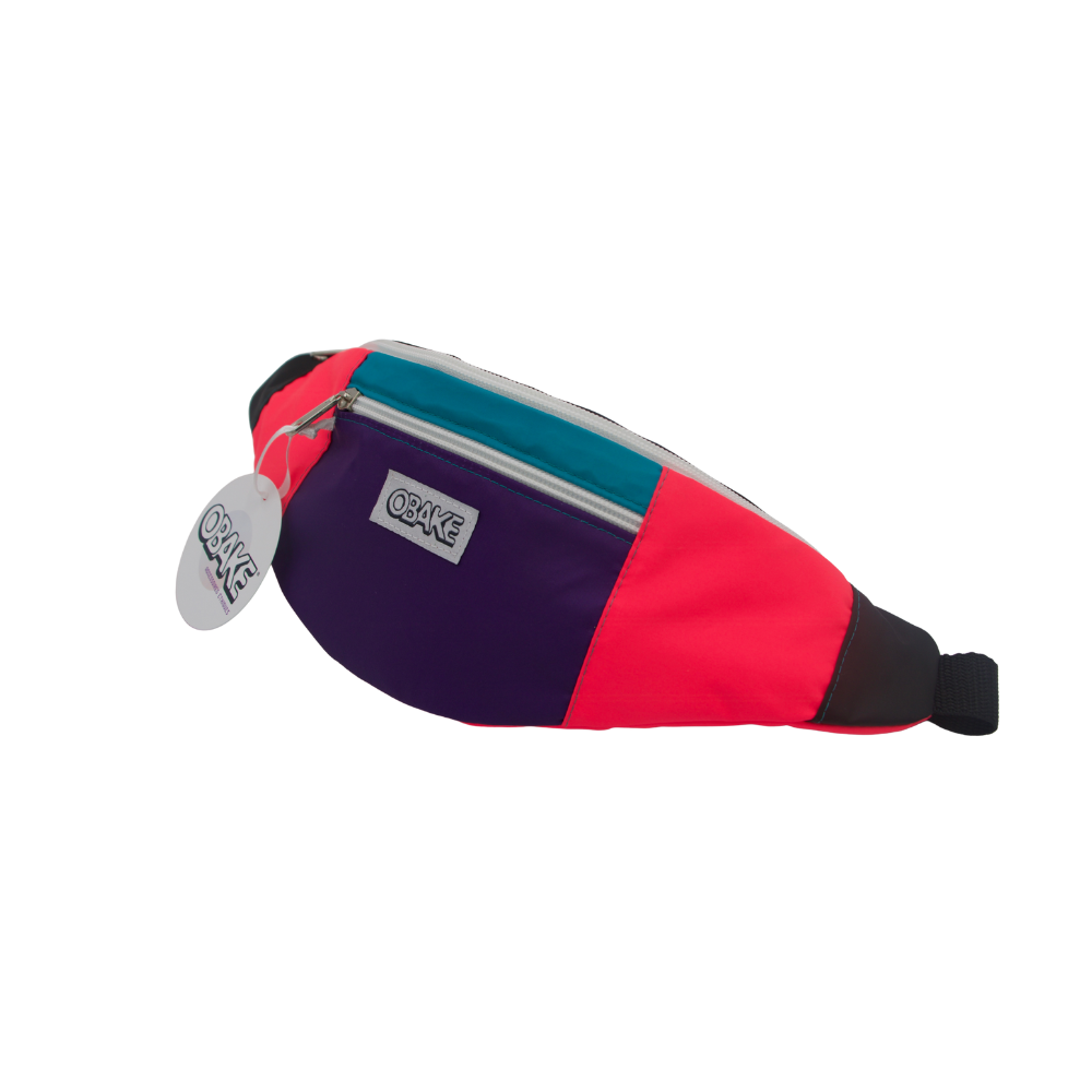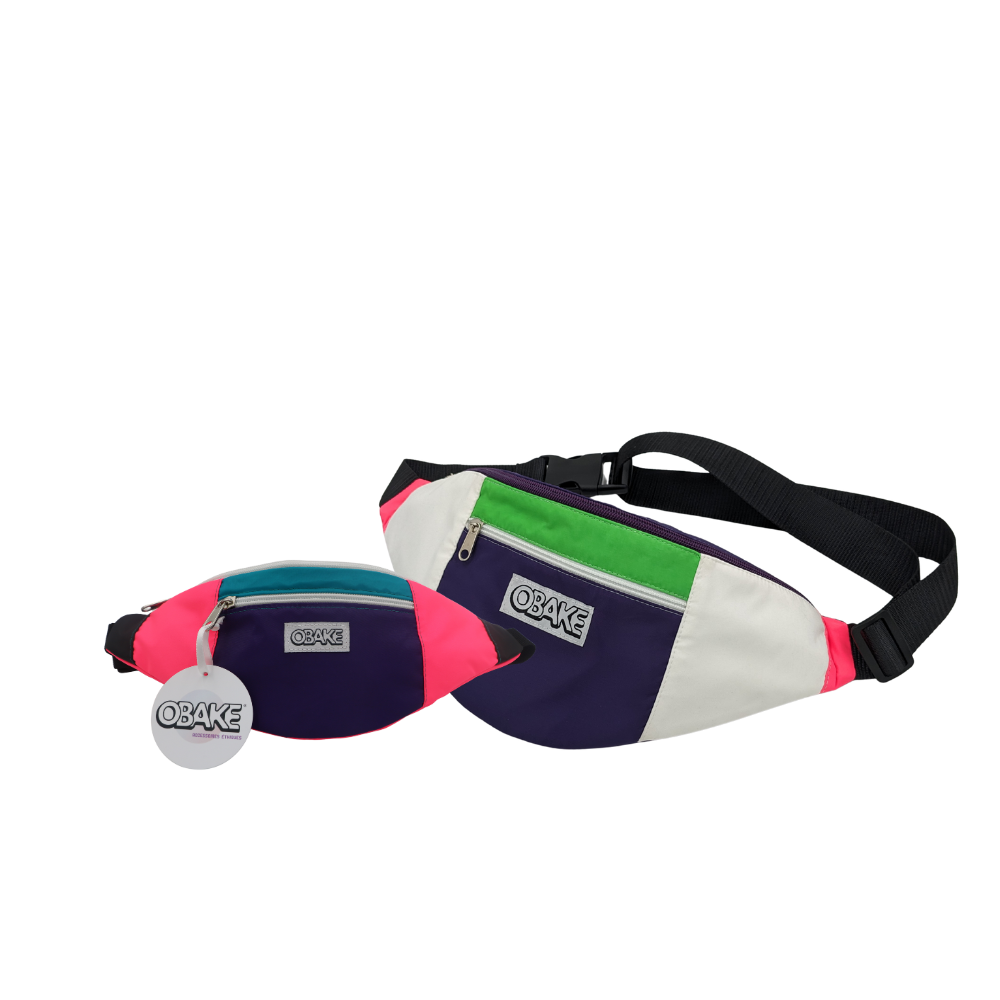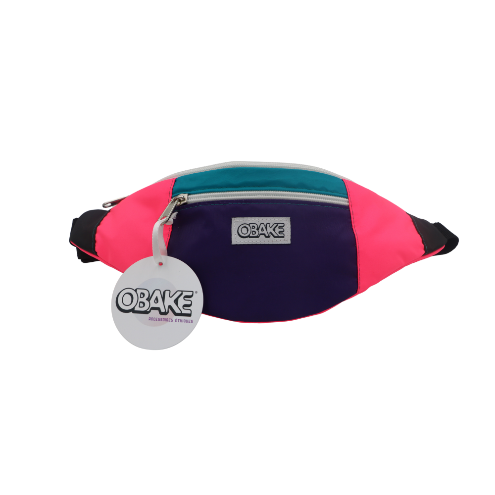 Banane imperméable petit format bleu, rose fluo et violet. Sangle noire réglable, fermeture éclair blanche et doublure intérieure noire. La banane est conçue pour un enfant à partir de 5–6 ans ou peut se porter à la taille par une femme.