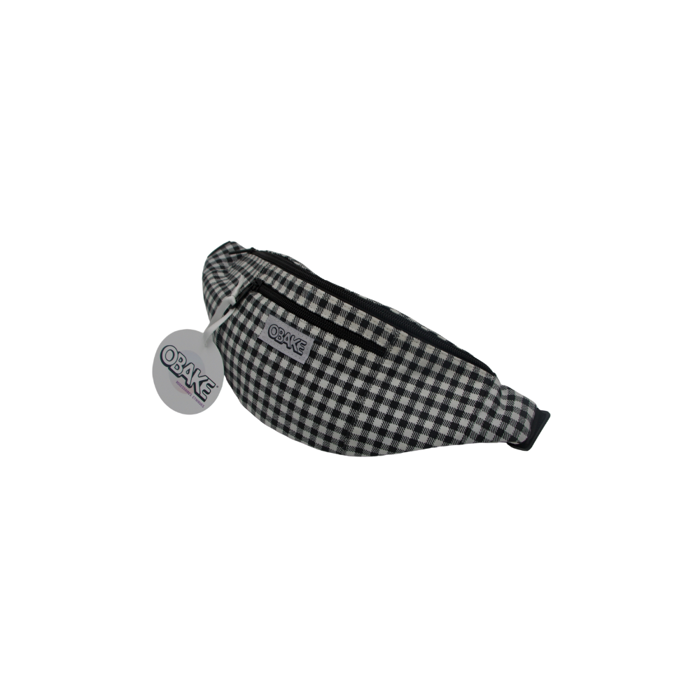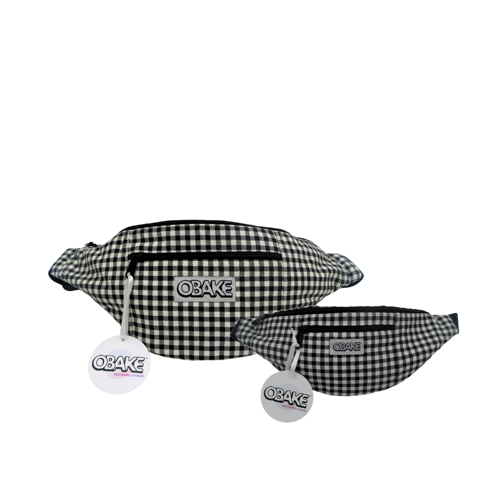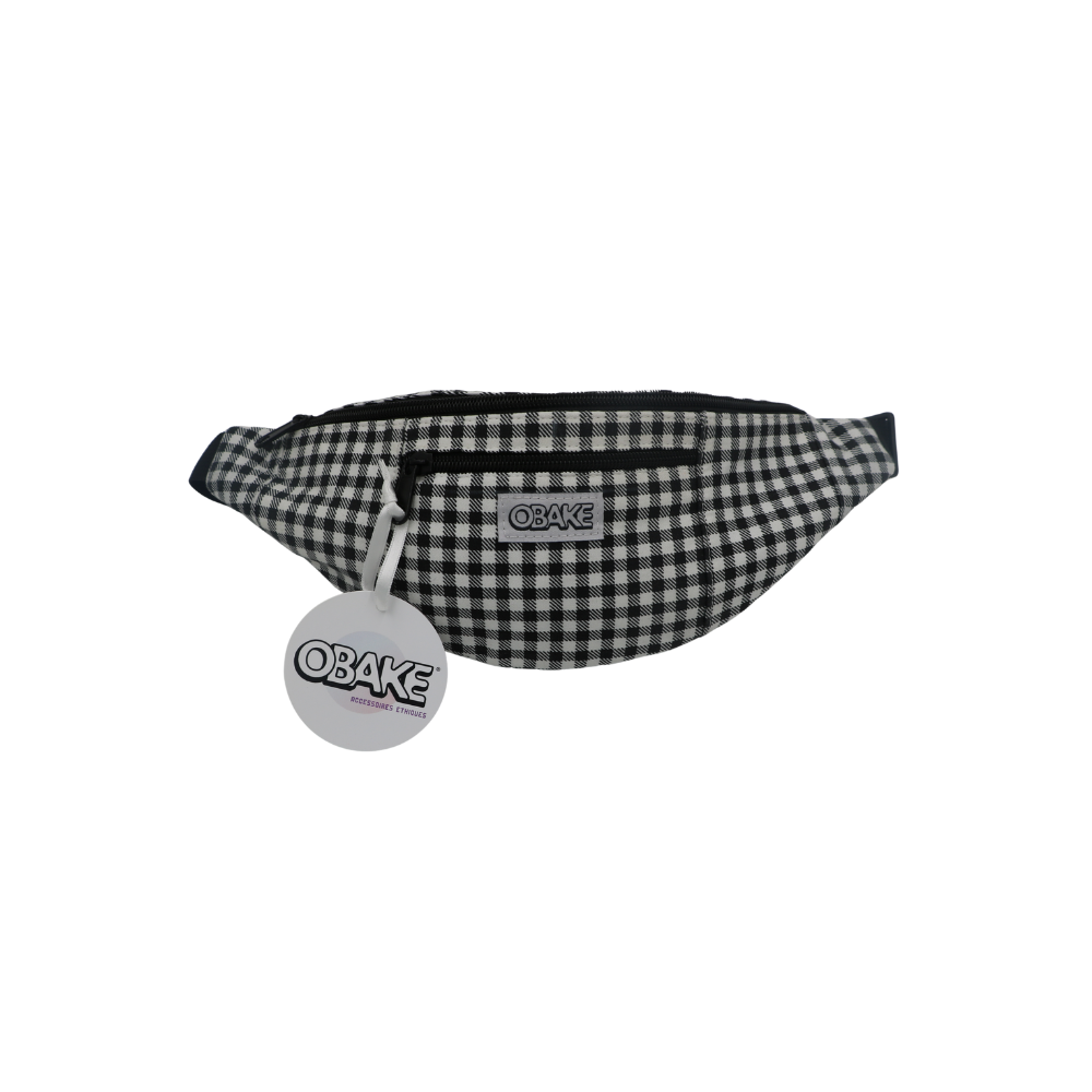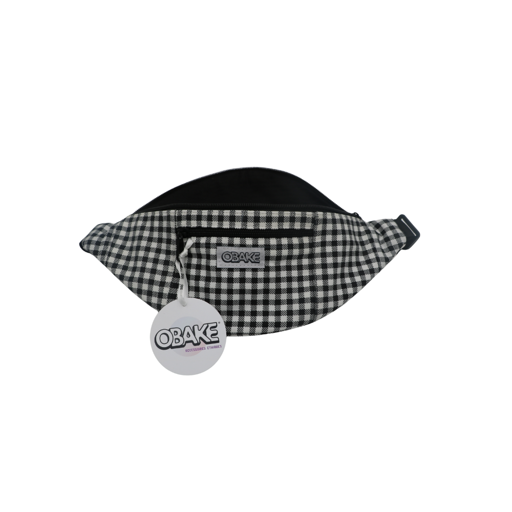 Banane petit format motif vichy noir et blanc. Sangle noire réglable, fermeture éclair noire et doublure intérieure noire. La banane est conçue pour un enfant à partir de 5–6 ans ou peut se porter à la taille par une femme.