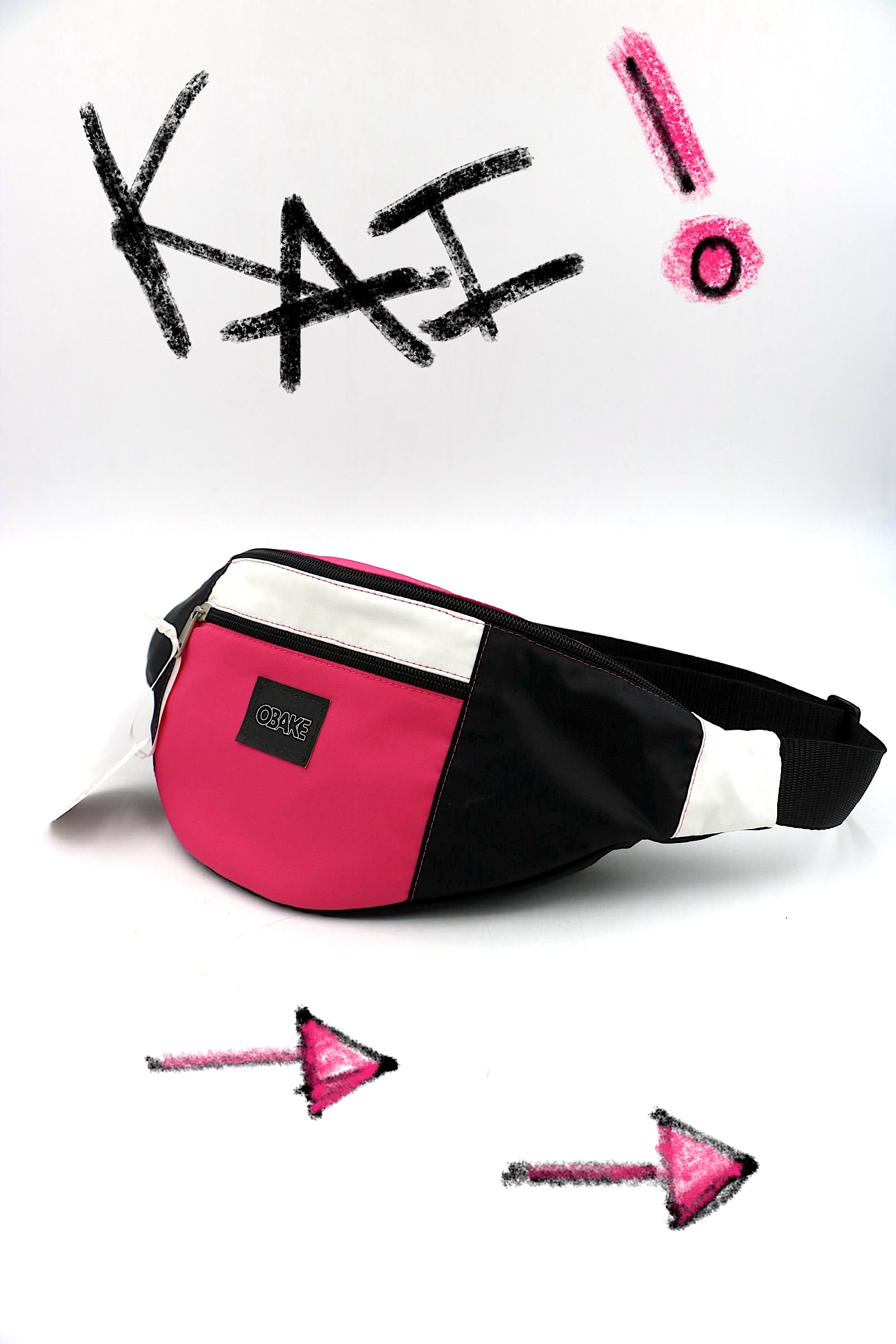 Découvrez le Sac Banane KAI, ce modèle allie rose vibrant et noir profond, pour un contraste urbain et poétique. Fabriqué artisanalement à Saint-Étienne, il incarne l’esprit OBAKE : réemploi créatif, streetwear engagé et authenticité brute.