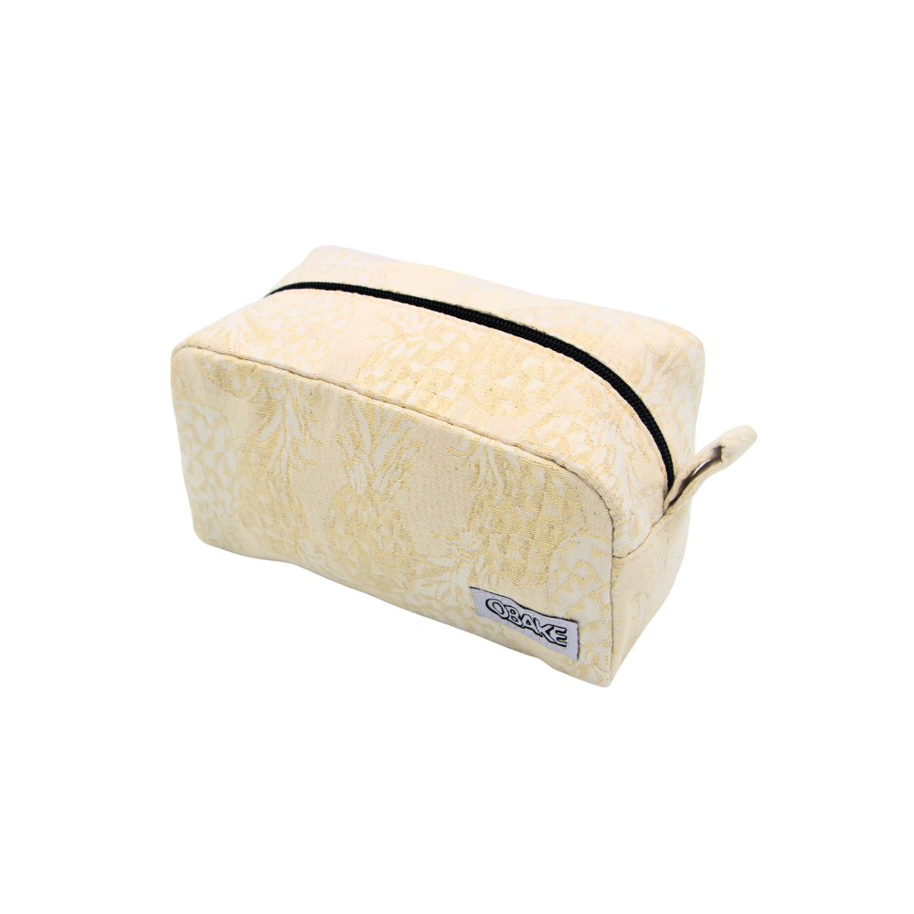 Trousse au format rectangulaire en coton. Cette trousse est blanc cassé et ornée de motifs ananas dorés.
